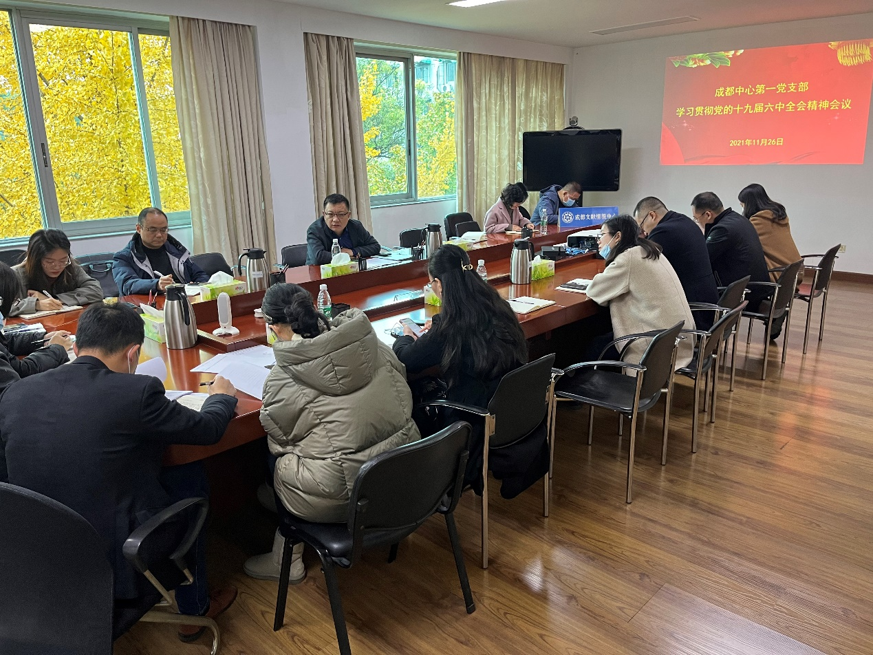 11月26日上午,成都文献情报中心第一党支部召开学习贯彻党的十九届六中全会精神专题会议。中心党委书记曲建升、党委委员文奕以普通党员身份参加了会议。会议由支部书记刘宇主持。
