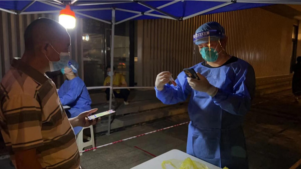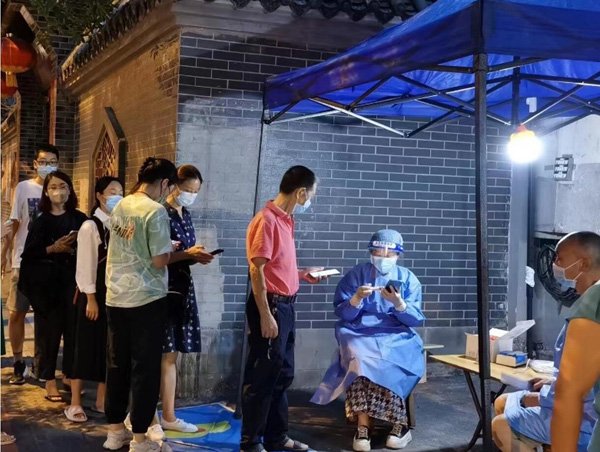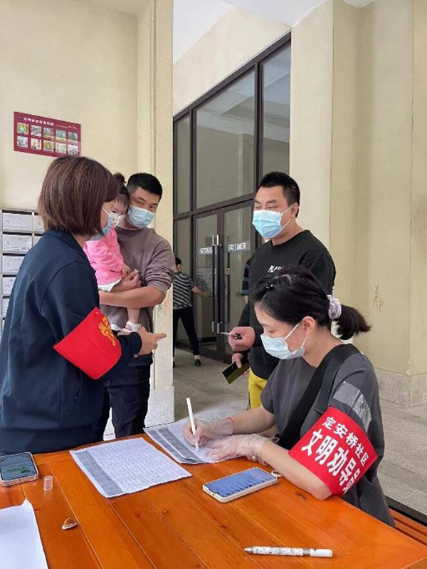 于方在社区防控一线引导队伍秩序及登记居民信息助力核酸检测