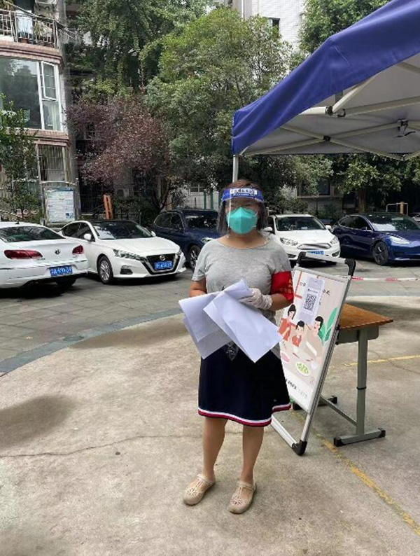 丁陈君在社区防控一线组织志愿者服务并引导核酸检测