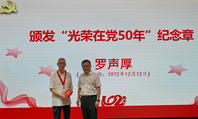 党员大会在国歌声中拉开帷幕。首先由党委书记曲建升向中心退休党员罗声厚同志颁发“光荣在党50年”纪念章。罗声厚同志于1972年12月加入中国共产党。纪念章是对罗声厚等老一辈党员同志对党忠诚、为党奉献的肯定和礼赞,同时也激励和鼓舞全体党员同志传承弘扬老一辈党员的奋斗精神,不忘初心、牢记使命,勇于拼搏、接力奋进。