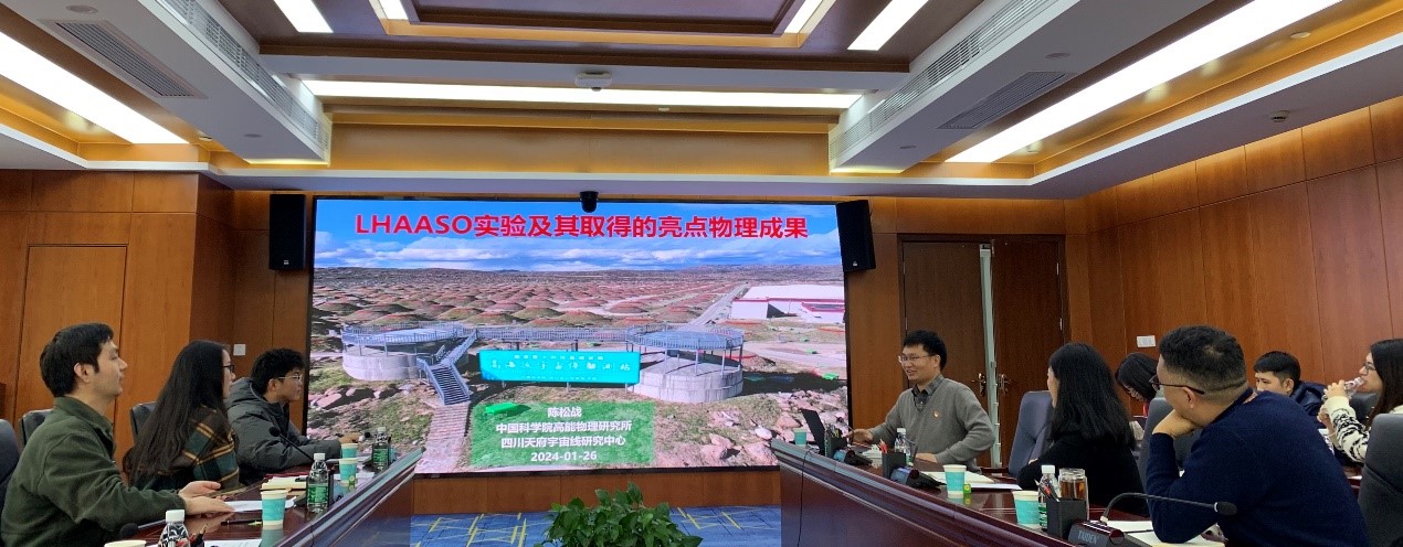 高能物理研究所粒子天体物理中心第一党支部组织委员王玉东概括介绍了支部情况及党员突击队与特色主题活动等。一支部副书记、天府宇宙线研究中心副主任陈松战研究员讲解了国家重大科技基础设施——高海拔宇宙线观测站,重点展现了科研团队挑战高海拔、战胜不可能海子山精神。天府宇宙线研究中心综合办公室主任罗婧全面介绍了中心定位、实验室、科技创新平台和未来规划。