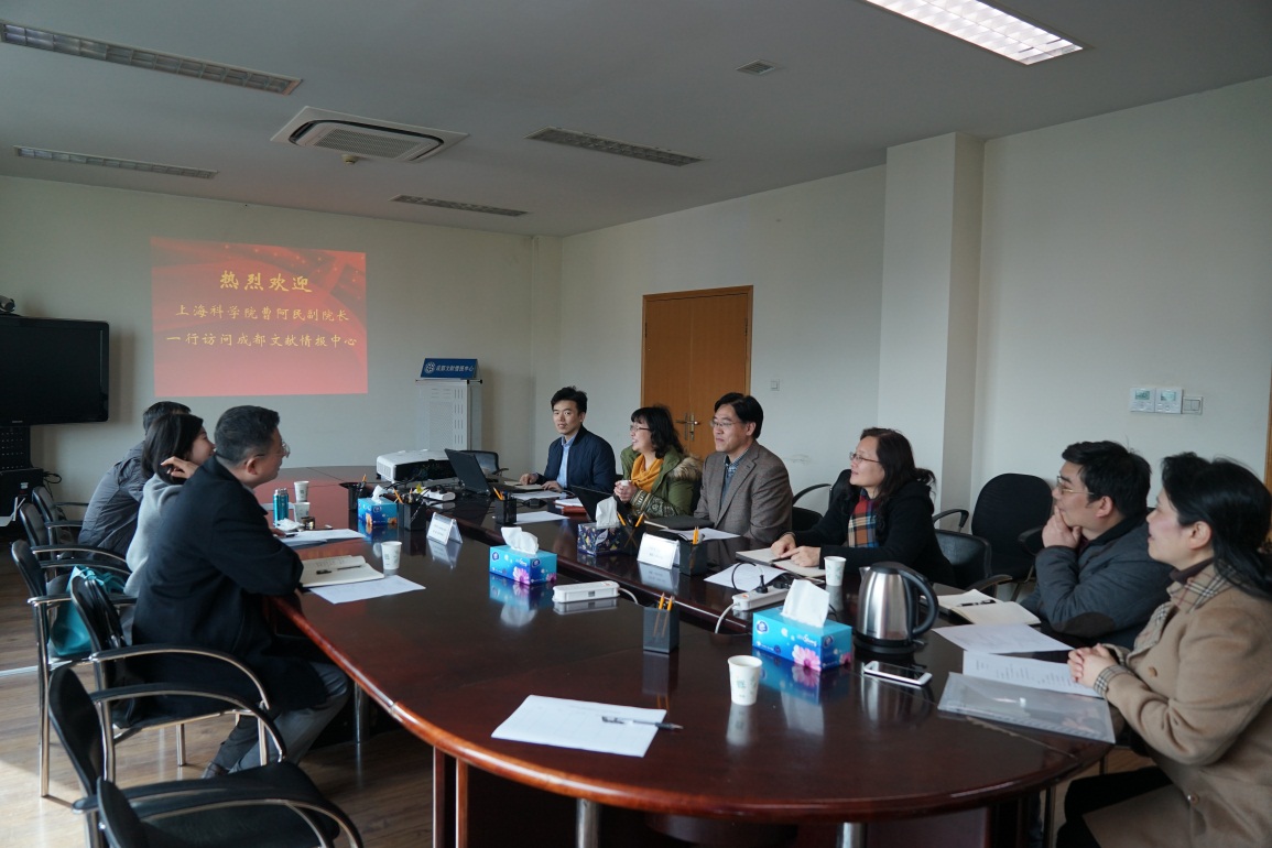 3月1日下午,上??蒲г焊痹撼げ馨⒚瘛⒐婊芯看Ω贝Τち跣×?、规划研究处姜凌一行访问了中国科学院成都文献情报中心,与中心主任张志强及副主任杨志萍、科技处副处长张邓锁、信息服务部主任鄢小燕、副主任任波、责任馆员韩红等相关人员就进一步深化合作进行了广泛的交流与座谈。
