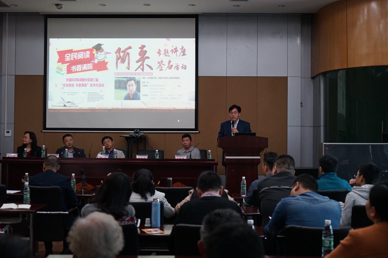 4月17日下午,当代著名作家、茅盾文学奖史上最年轻获奖者、四川省作协主席阿来应邀做客第三届成都分院“全民阅读,书香满院”读书月活动讲堂,在成都文献情报中心学术厅作专题讲座。成都文献情报中心主任张志强、中心副主任杨志萍、中科院成都分院综合办主任江晓波、四川省青少年作协主席王永忠陪同阿来参观了中心并参加了讲座,成都分院各单位职工、硕博士生、社区群众以及慕名而来的读者朋友约100多人聆听了讲座。成都分院分党组书记、常务副院长王学定专程与阿来、王永忠进行了专门交流。