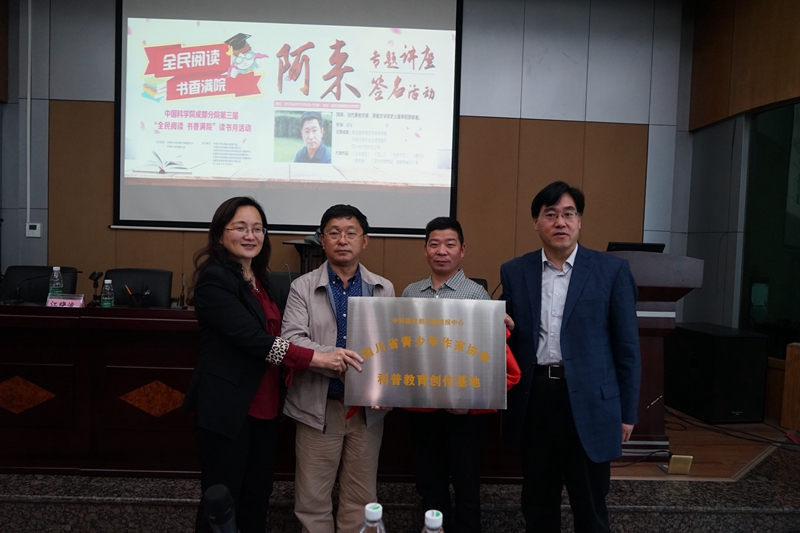 之后,阿来为成都文献情报中心授牌“四川省青少年作家协会科普教育创作基地”,此基地为成都文献情报中心和四川省青少年作家协会共同建设,以中心丰富的科技信息知识资源和科技信息服务人才为平台,支持广大青少年开展科普教育创作,为青少年搭建科学文化传播的桥梁,强有力推进四川地区青少年科学素养的持续提升。