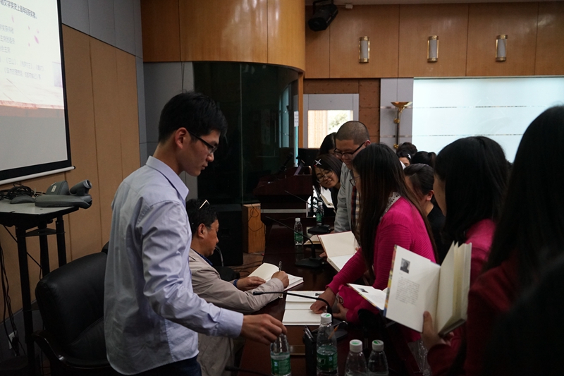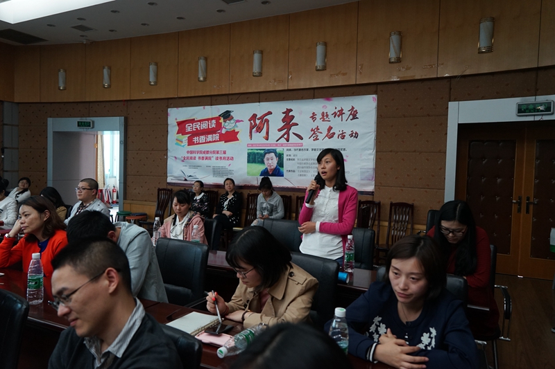 现场听众们踊跃提问,结合自己对讲座内容的理解与阿来互动交流,讲座在读者朋友们热烈的掌声中圆满落幕。最后,阿来为现场众多书迷们进行了签名拍照留念。此次讲座的成功举办为成都分院科研人员、硕博士生提供了与作家对话的平台,有益于激发听众们多读书、读好书的意识,帮助培养人们良好的阅读习惯和态度,营造良好的阅读氛围和书香气息,进一步丰富成都分院科学文化建设体系。