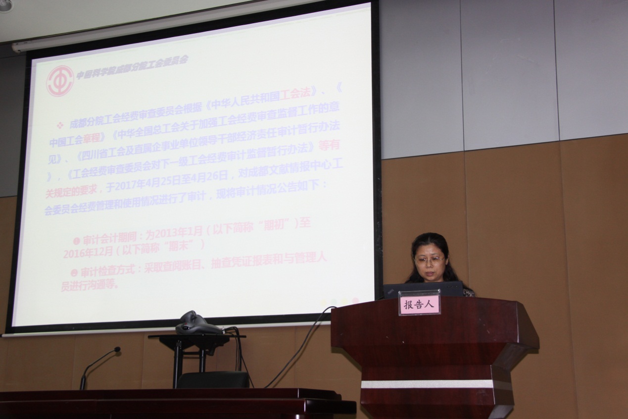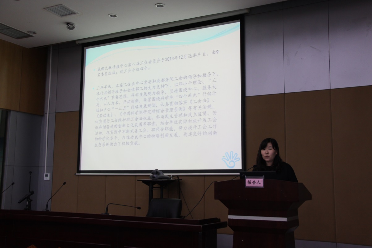 大会首先听取了中心工会副主席陈方代表第八届工会委员会作的《中国科学院成都文献情报中心第八届工会委员会工作报告》,报告从组织体系建设、履行维权职责、参与民主管理、建设创新文化、开展帮扶活动、日常规范管理等七个方面对本届工会工作进行了回顾和总结,认真分析了存在的不足,并对今后的工会工作提出了展望和建议。中心工会会计杨倩代表第八届工会委员会作了《中国科学院成都文献情报中心工会委员会第八届财务工作报告》。到会会员一致审议通过这两个报告。随后成都分院工会经费审查委员会副主任罗桦作了《成都文献情报中心第八届工会委员会主席任期经费审计结果公告》。