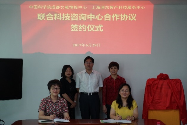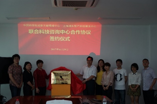2017年6月29日,上海浦东新区知识产权局副局长鲍英、专利促进处处长何瑛,上海浦东智产科技服务中心主任孔佳薇、副主任叶青一行4人访问中国科学院成都文献情报中心,就知识产权研究与服务工作举行交流座谈会,并举行了中科院成都文献情报中心与上海浦东智产科技服务中心共建“联合科技咨询服务中心”的合作协议签约仪式。成都文献情报中心主任张志强、副主任杨志萍,以及学科咨询服务部、情报研究部、信息技术部等部门相关负责人等参加座谈会与签约仪式。张志强主持座谈会。