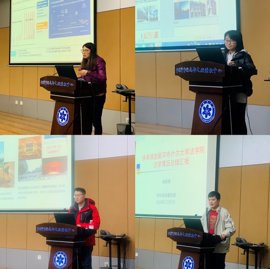 李姝影汇报了赴波特兰州立大学访问学习专利技术分析的情况,分享了利用数据分析及专家访谈法,提升专利分析支撑决策咨询服务能力和研究能力的收获。周涛就访问伊利诺伊大学的情况作了汇报,介绍在网络信息分析、信息咨询、数据分析算法、数据可视化等方向的学习收获。徐英祺就访问新罕布什尔大学法学院的情况作了介绍,围绕知识产权图书馆建设与服务、深化数字时代专利信息挖掘、知识产权、技术转移与全球发展等方面的学习收获作了汇报。杨宁总结了访问肯特州立大学的学习情况,介绍了在知识组织体系、关联数据与开放数据等方面的学习收获。