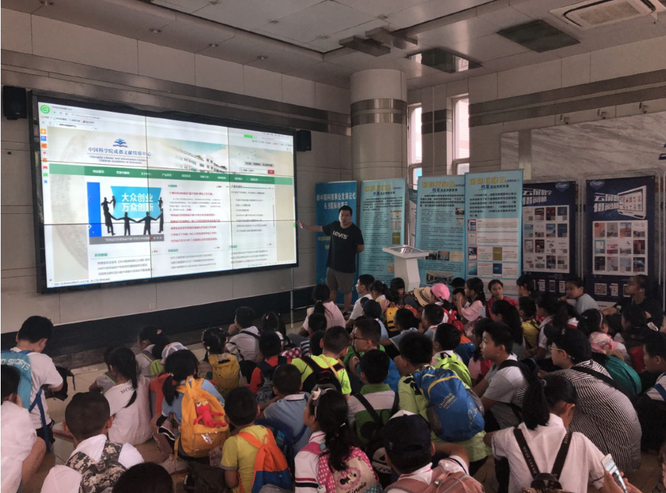 成都文献情报中心科普工作人员通过视频辅助向学生简要宏观的介绍了中心,引导学生们观看了线上科普展览和科普视频,体验了数字阅读,并实地参观学习了科普展览《科学人生?百年——院士风采展》。