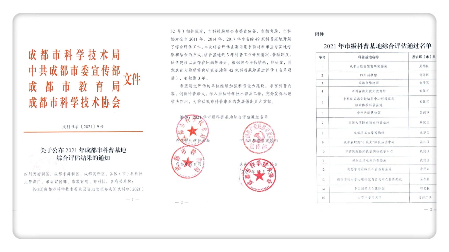 中科院成都文献情报中心通过成都市科普基地复核 来源: 文献服务部 发布时间: 2021年12月24日 12月23日,成都市科技局、中共成都市委宣传部、成都市教育局及成都市科学技术协会联合发文公布2021年成都市科普基地综合评估结果,中科院成都文献情报中心通过了科普基地复核综合评估。 自2017年中心被认定为成都市科普基地以来,积极开展科普工作,多次得到成都市科技局的肯定和表彰。今年应成都市科技局要求总结近年来科普工作成效,报送相关证明资料,接受科普基地复核考核并顺利通过,认定有效期为3年。 附件下载: 分享: 上一条:成都文献情报中心新版中文机构网站正式上线 下一条:成都文献情报中心组织开展第四届中科院科学节活动