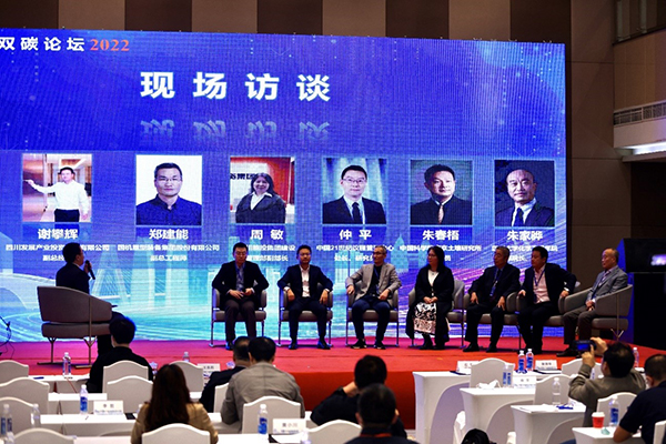 现场访谈环节,四川省委省政府决策咨询委员会科技组组长王学定研究员、国机重型装备集团股份有限公司副总工程师郑建能、朱家骅、仲平、四川发展产业投资服务有限公司副总经理谢攀辉、四川能投集团建设管理部副部长周敏、朱春梧7位嘉宾围绕科技创新推动双碳目标实现、核电和可再生能源开发利用、新型电力体系建设、双碳投资与招商引资、资源优势禀赋与动力转化、土壤富碳减排、联合国气候变化框架公约、四川绿色低碳产业发展、低碳能源等领域的挑战与机遇展开讨论。