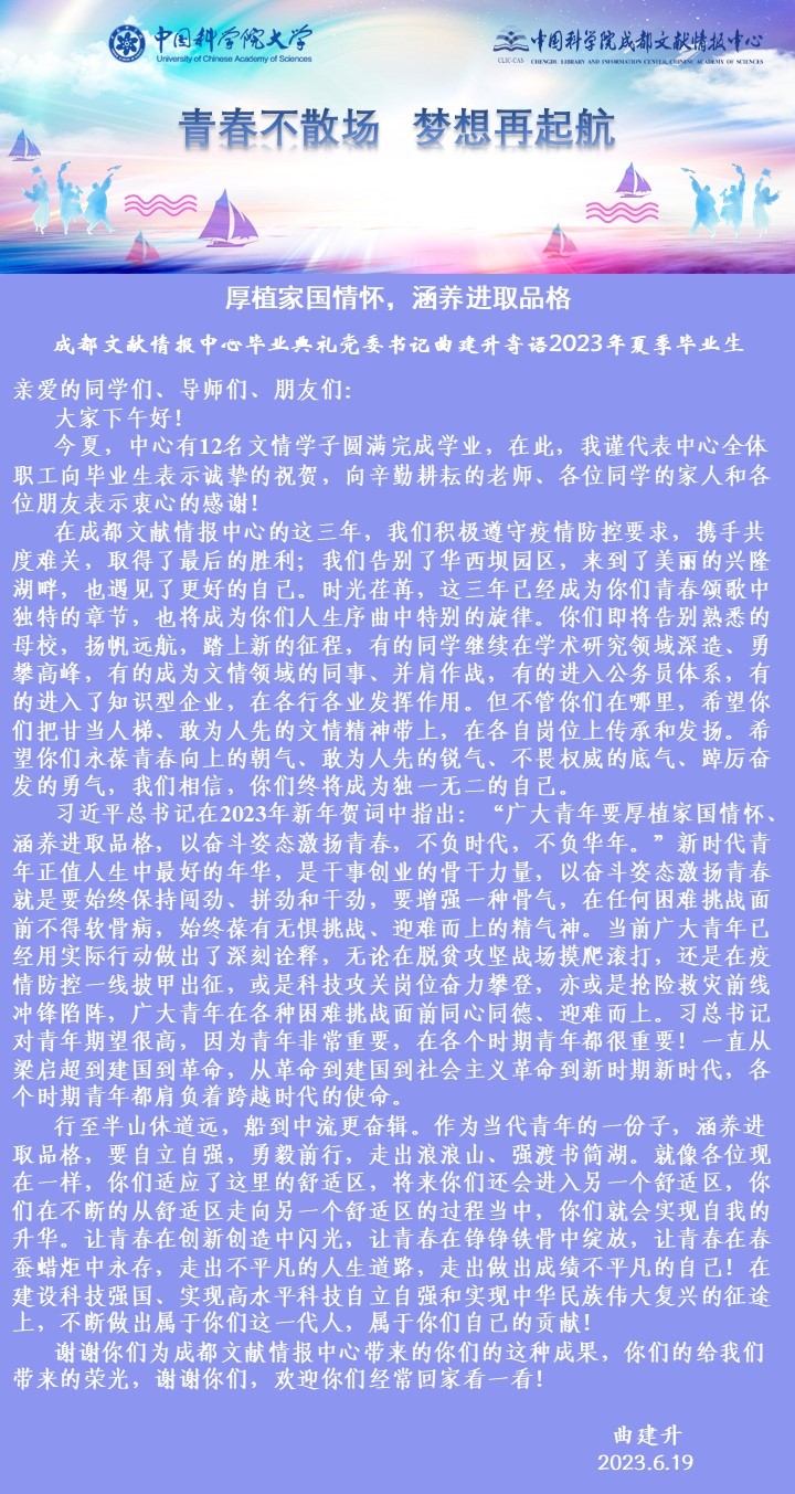曲建升向全体毕业生表示了诚挚的祝贺,希望大家在各自岗位上继续传承和发扬“甘为人梯、敢为人先”的文情人精神,希望大家永葆青春向上的朝气、不畏权威的底气和踔厉奋发的勇气,希望大家要厚植家国情怀、涵养进取品格,以奋斗姿态激扬青春,不负时代,不负华年。在建设科技强国、实现高水平科技自立自强和实现中华民族伟大复兴的征途上,不断做出属于自己的贡献。