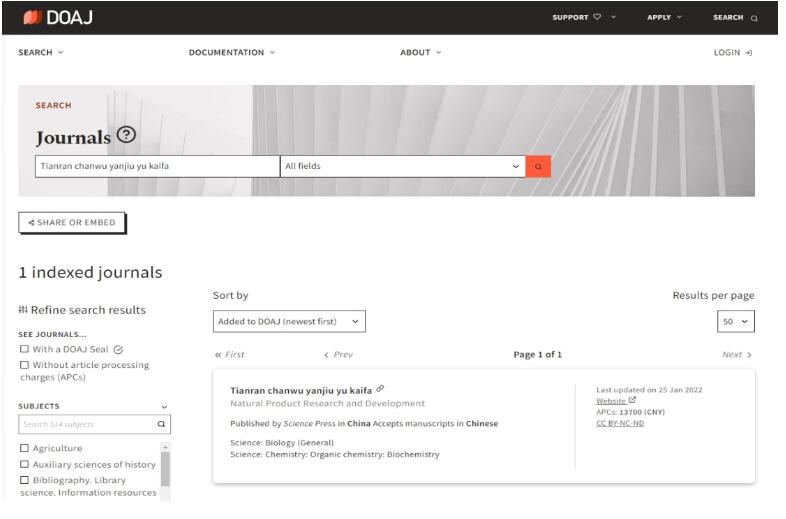 2022年1月25日,《天然产物研究与开发》被国际知名期刊目录数据库DOAJ (Directory of Open Access Journal)收录。