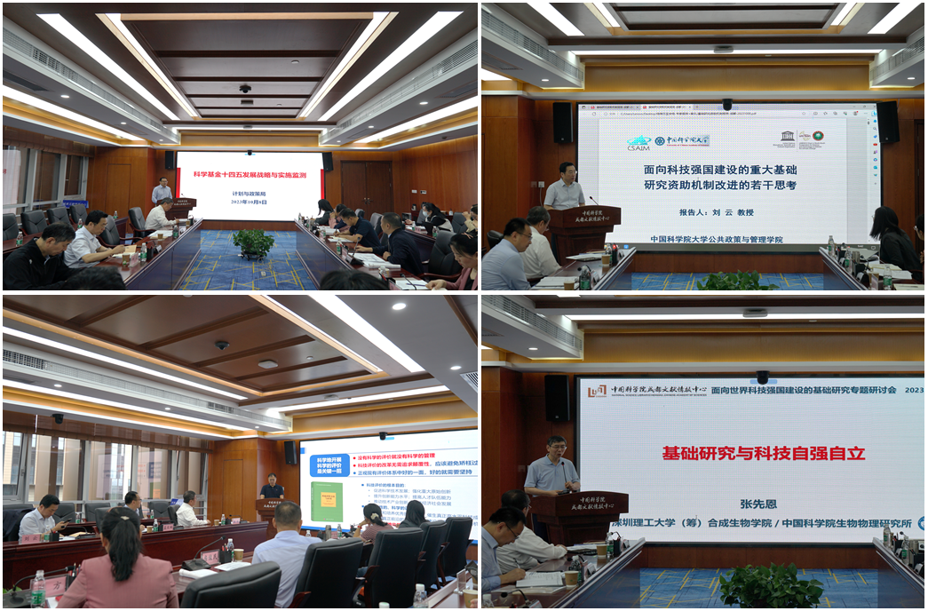 国家自然科学基金委计划与政策局发展战略处处长孟庆峰、中国科学院大学公共政策与管理学院副院长刘云教授、中国科学院成都文献情报中心创新研究部主任陈云伟研究员和深圳理工大学(筹)合成生物学院院长/中国科学院生物物理研究所张先恩研究员分别作题为“科学基金十四五发展战略与实施监测”“面向科技强国建设的重大基础研究资助机制改进的若干思考”“我国加强基础研究面临的形势与需求”“基础研究与科技自强自立”的专题报告。