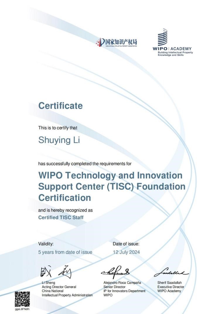 2024712日,中国科学院成都文献情报中心知识产权研究中心李姝影副研究员成功完成了世界知识产权组织(WIPO)在华技术与创新支持中心(TISC)员工认证项目的培训与考核,获得相关证书。该项目是由国家知识产权局组织在华TISC机构参与,经WIPO遴选,全国共有12TISC机构的14名员工入选。