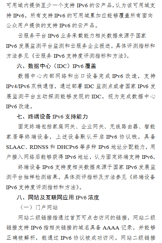 (四)全面扩大数据中心(IDC)IPv6覆盖范围。中国电信、中国移动、中国联通进一步加强对中小型数据中心和机房的IPv6改造。阿里云、腾讯云、百度云、京东云、华为云、世纪互联、鹏博士、秦淮科技、新网互联、方正信息、西部数码、万国数据、光环新网加快数据中心IPv6改造力度,到2020年第三季度末,完成年报中全部数据中心的IPv6改造,形成全国范围数据中心IPv6覆盖能力。