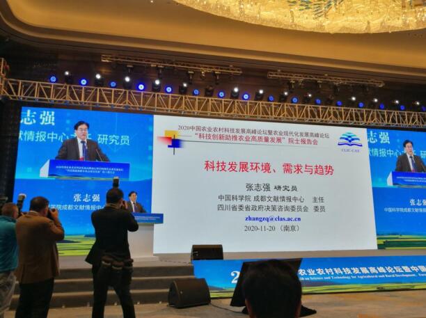 11月20-21日,2020中国农业农村科技发展高峰论坛暨中国现代农业发展论坛在南京举办,论坛包括发布会、院士报告会和五个专题论坛。整个论坛共有500多位嘉宾和代表报名参加。中国科学院成都文献情报中心主任、四川省委省政府决策咨询委员会委员张志强应邀在20号的“科技创新助推农业高质量发展”院士报告会上题为《科技发展环境、需求与趋势》的主题报告。