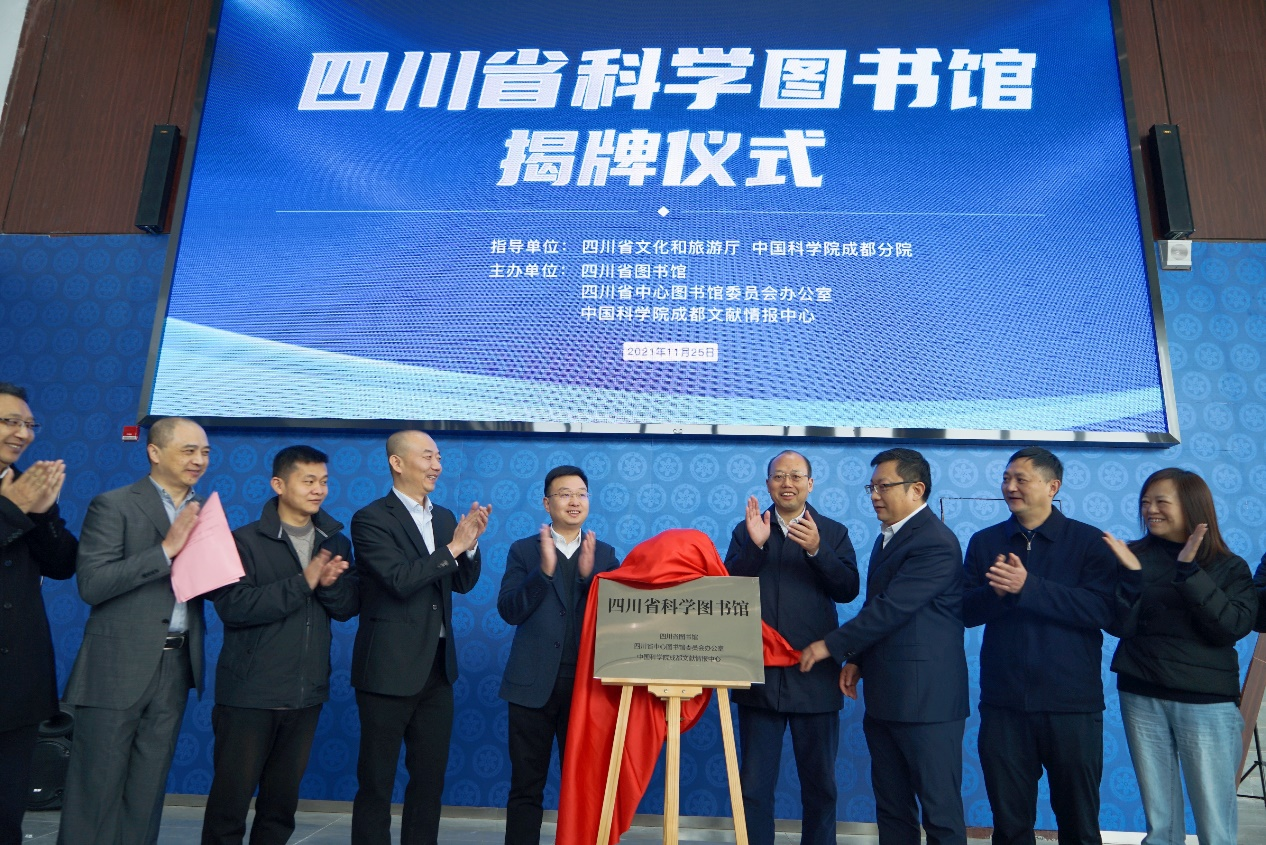11月25日,四川省科学图书馆在成都科学城正式揭牌。四川省文旅厅副厅长赵红川,中科院成都分院分党组成员、机关党委书记刘刚君,中科院成都文献情报中心党委书记曲建升,四川省图书馆馆长王龙共同为四川省科学图书馆揭牌?;疃沙啥嘉南浊楸ㄖ行牡澄笔榧?、主任邓勇主持。