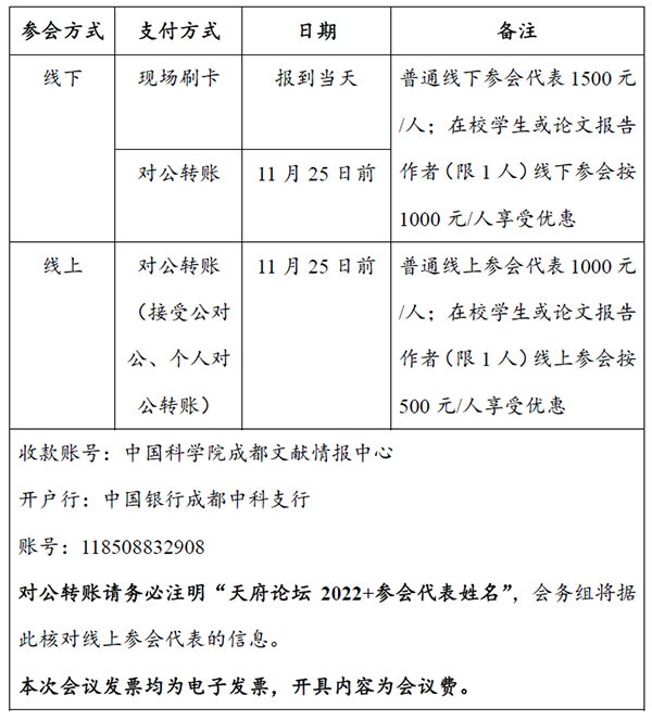 本次论坛将采用线上、线下相结合的方式举办。线下参会代表可于报到当天现场刷卡支付会议费,也可于11月25日前完成对公转账;线上参会代表请于11月25日前完成对公转账缴费?;嵋榉延萌缦拢?/span>